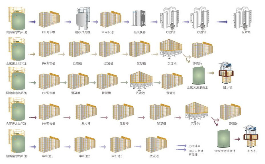 废水处理技术能够根据杂质特性,采用针对性的工艺高效、经济地完成处理。通过多级化学混泥沉淀、氨氮吹脱、生物处理等工艺的结合,能够有效处理污染物繁多、性质复杂的高端电子、半导体行业废水,实现深度去除污染物。涵盖了先进制程产线可莪能产生的废水种类,处理高效高,运行成本低。